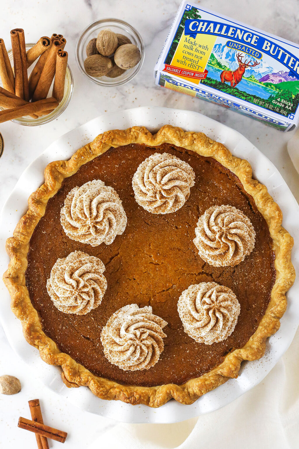 - Burro: il burro in questa ricetta è rosolato, il che conferisce a questa torta un sapore più profondo e migliore. È un passo in più, ma ne vale assolutamente la pena. E usare un burro di qualità è sempre d’obbligo, sia nella crosta della torta che nel ripieno! Ho usato il mio burro Challenge preferito. Challenge Butter è un burro cremoso di alta qualità che va dalla fattoria al frigorifero in soli due giorni, assicurando che sia bello e fresco. Non ha ormoni aggiunti, aromi artificiali o ripieni, quindi puoi sentirti bene a darlo da mangiare alla tua famiglia. Se non l’hai mai provato prima, devi assolutamente farlo. Migliorerà sicuramente la cottura e la cottura.