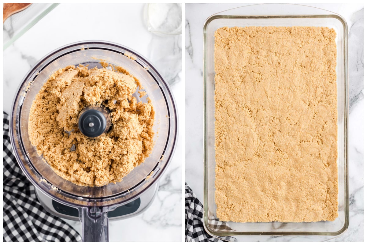- Unire il burro fuso alle briciole di biscotti. Premere uniformemente il composto di briciole di biscotti sul fondo di un piatto 9×13 (22,86 cm x 33,02 cm).