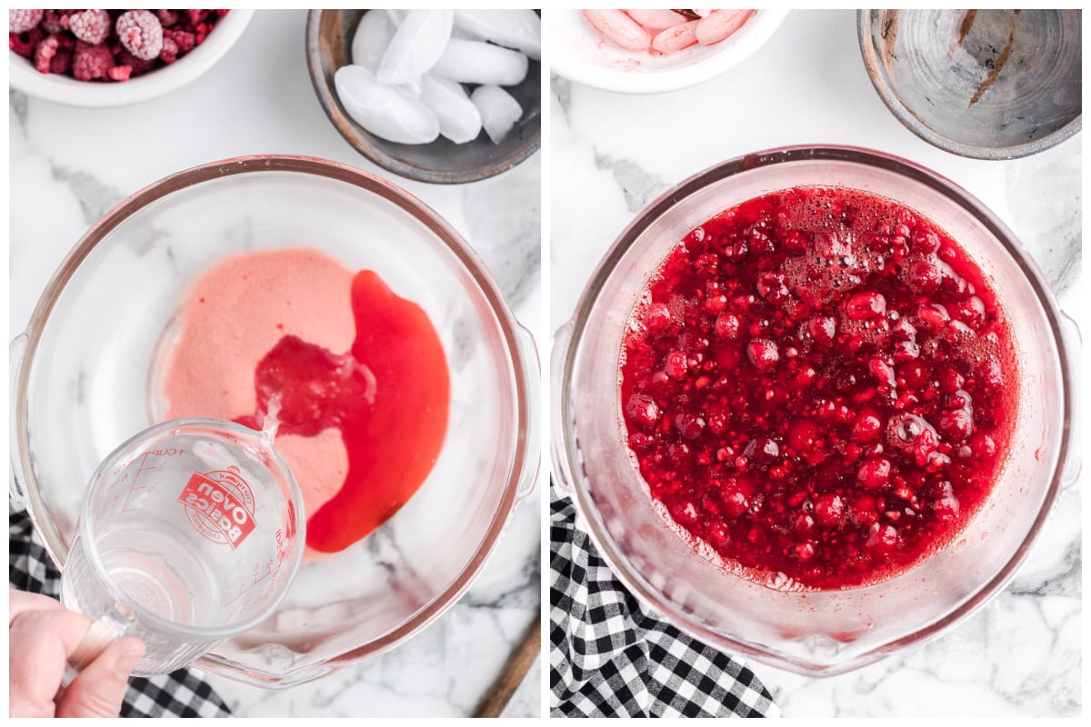 - Sciogliere la gelatina al gusto di lampone in acqua bollente.