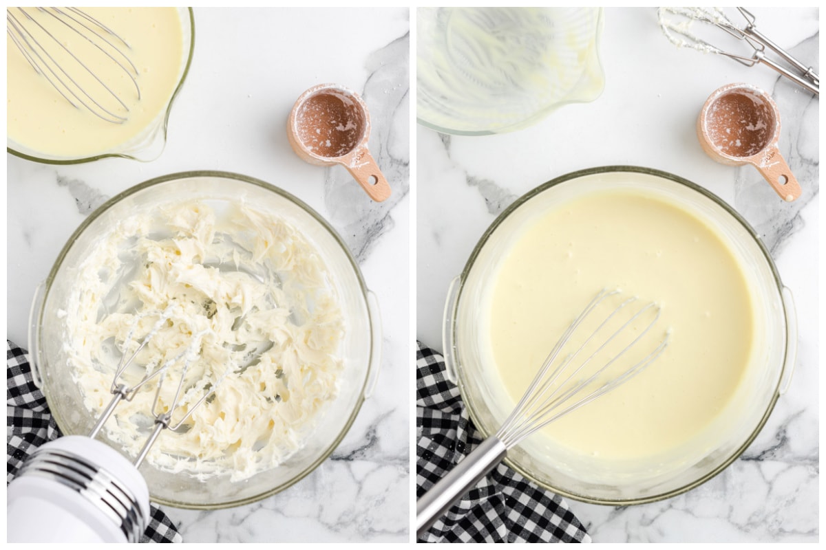 - In un’altra grande ciotola, sbattere insieme il formaggio cremoso e lo zucchero a velo, con una frusta a mano a media velocità, fino a che liscio. Aggiungere il composto di budino al limone al composto di crema di formaggio. Mescolare fino a quando non è completamente combinato e liscio.