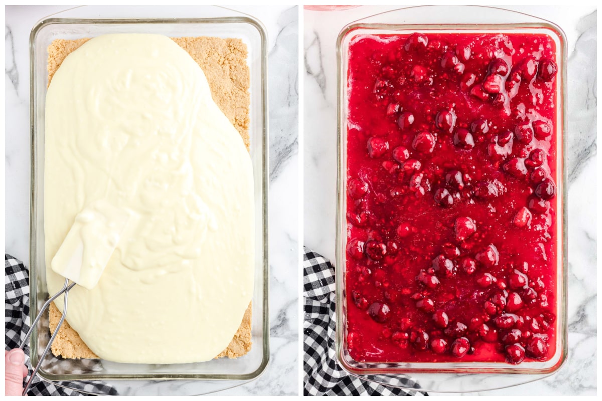 - Distribuire la miscela di gelatina di lamponi fredda sullo strato di crema di formaggio; attenzione a non far amalgamare gli strati. **Se la tua gelatina di lamponi è ancora abbastanza sciolta a questo punto, rimettila in frigorifero per altri 10-15 minuti per rassodare quanto basta per stenderla ma NON completamente rassodata**
