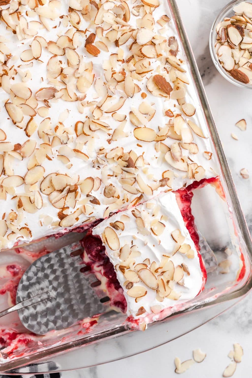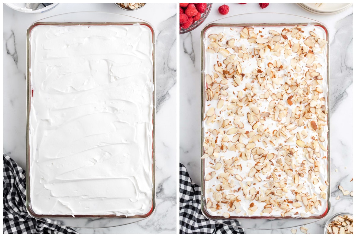 - Ricoprire lo strato di lamponi con la copertura montata. Cospargere le mandorle a lamelle sopra la copertura montata.