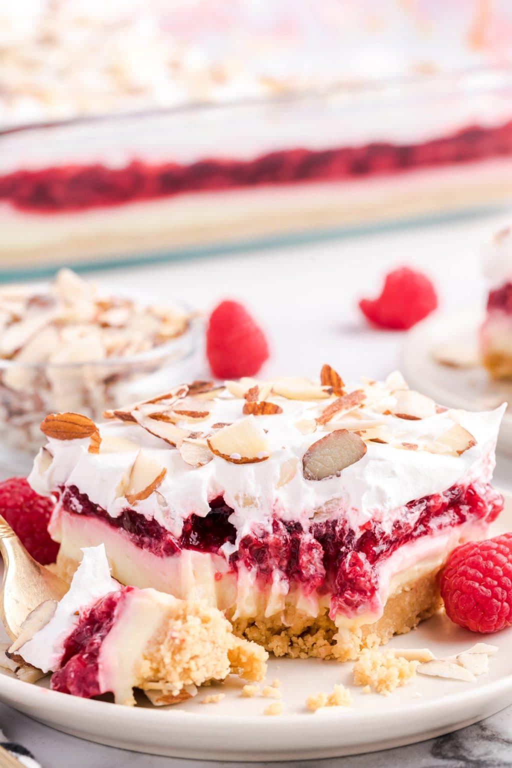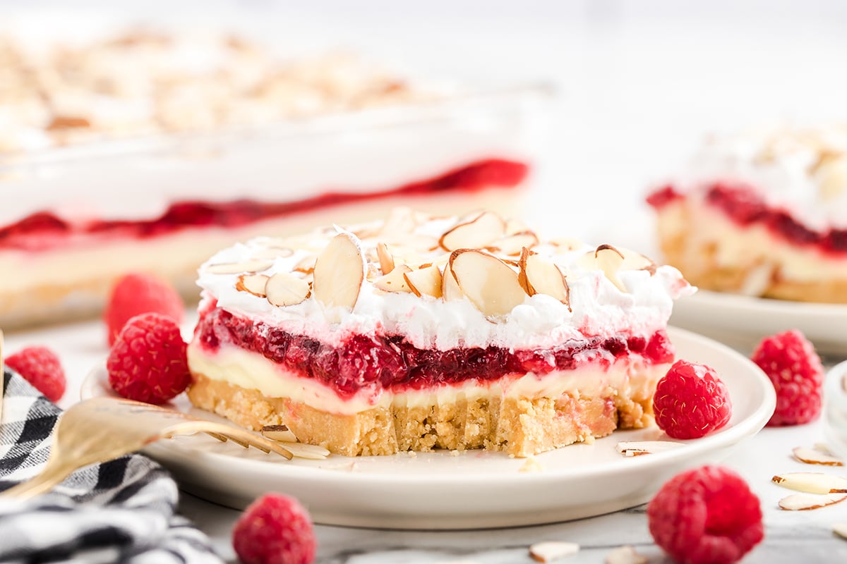 Questa lasagna ai lamponi è un dessert gustoso che non richiede cottura e un lavoro di preparazione minimo. È pieno di strati di sapori dolci e aspri che si abbinano perfettamente a trame leggere e soffici, il tutto assemblato su una crosta di biscotti.