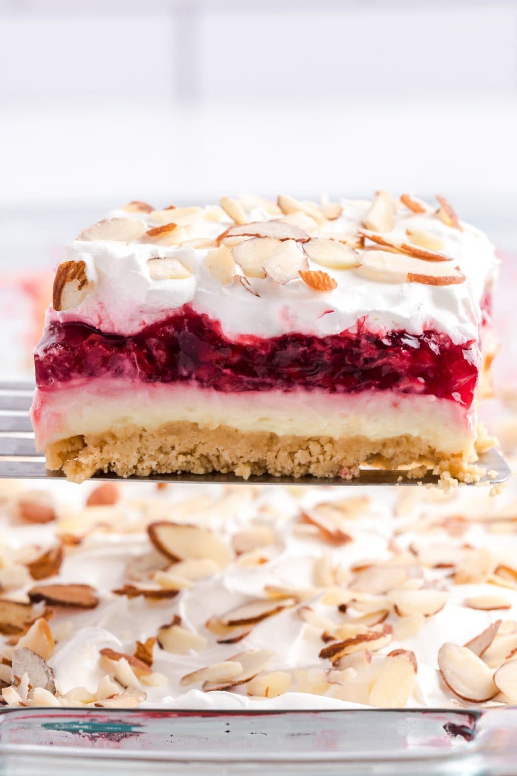 Metti le lasagne al lampone in frigorifero per almeno 6 ore, o tutta la notte, per raffreddare e rassodare prima di tagliare e servire.