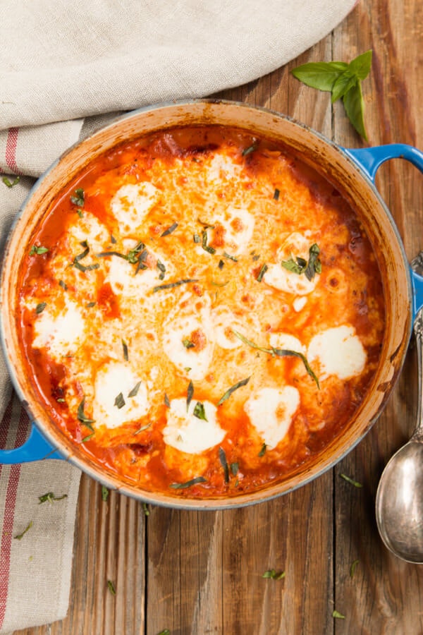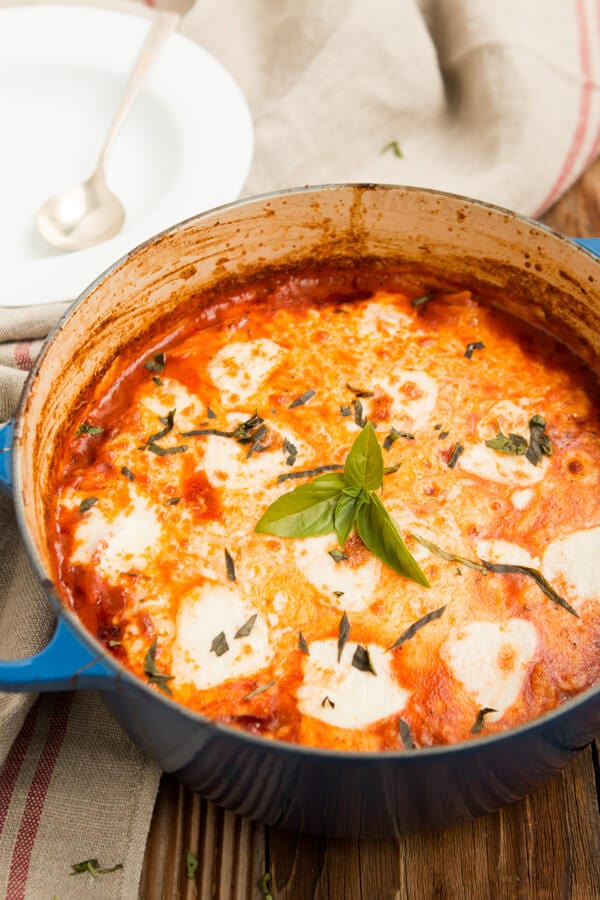 Ovviamente se trovi che la pasta al sugo non fa per te puoi sempre cuocerla a parte e poi buttarla all’ultimo minuto. Ma ci piace tutto cucinato insieme e la pasta prende davvero il sapore del sugo. E assicurati di usare una ricotta fresca e una buona mozzarella. Fa davvero la differenza. In effetti è per questo che molti dei tuoi piatti italiani non assomigliano al ristorante, perché la mozzarella non era così buona.