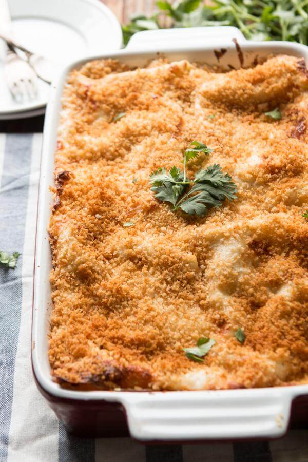 Ci piace anche usare solo un pollo arrosto invece di cucinare il nostro. È la quantità perfetta di carne e se ho troppa carne posso facilmente preparare l’insalata di pollo un altro giorno. Ma il vero vincitore? Bene, queste sono quelle briciole di pane panko dorate e burrose in cima ovviamente! YUM!!! Aggiungono un bel po’ di croccantezza e sono assolutamente la mia parte preferita.