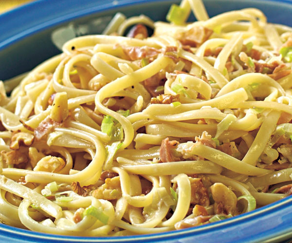 Tagliate a rondelle i porri (solo la parte bianca) e scottateli per 5 minuti in acqua bollente; sgocciolateli e trasferiteli in un tegame con 4 cucchiai d’olio. Bagnate con 2 cucchiai d’acqua e stufateli per una decina di minuti; poi, versate un mestolo di brodo caldo. Salate, pepate e cuocete per una ventina di minuti. A questo punto, frullate tutto e tenete da parte. Riducete la pancetta a listarelle sottili e saltatela in padella senza condimento. Lessate le linguine; scolatele al dente e rigiratele in tegame con la salsa preparata. Aggiungete la pancetta e una manciata di parmigiano; amalgamate bene e servite.