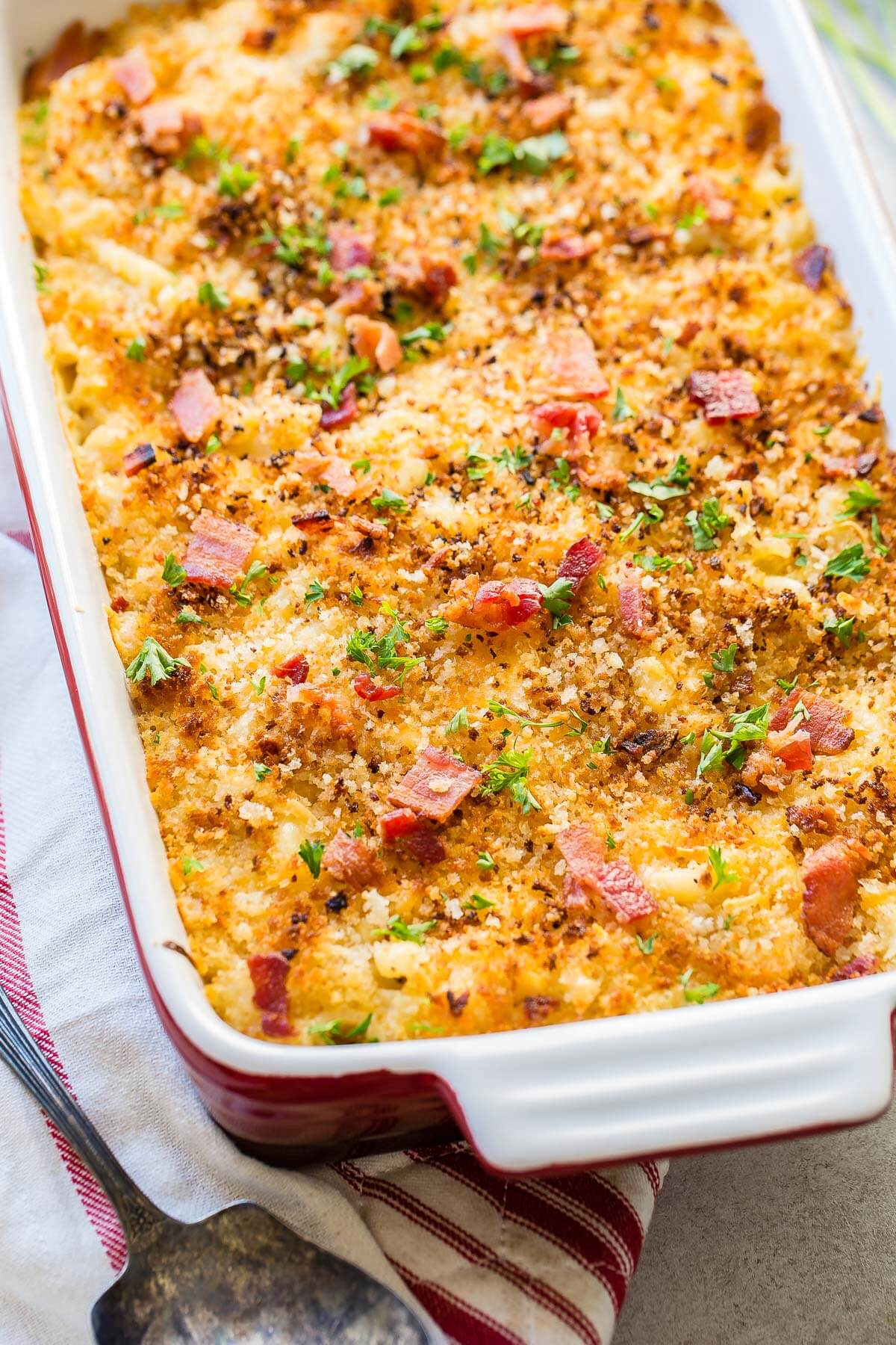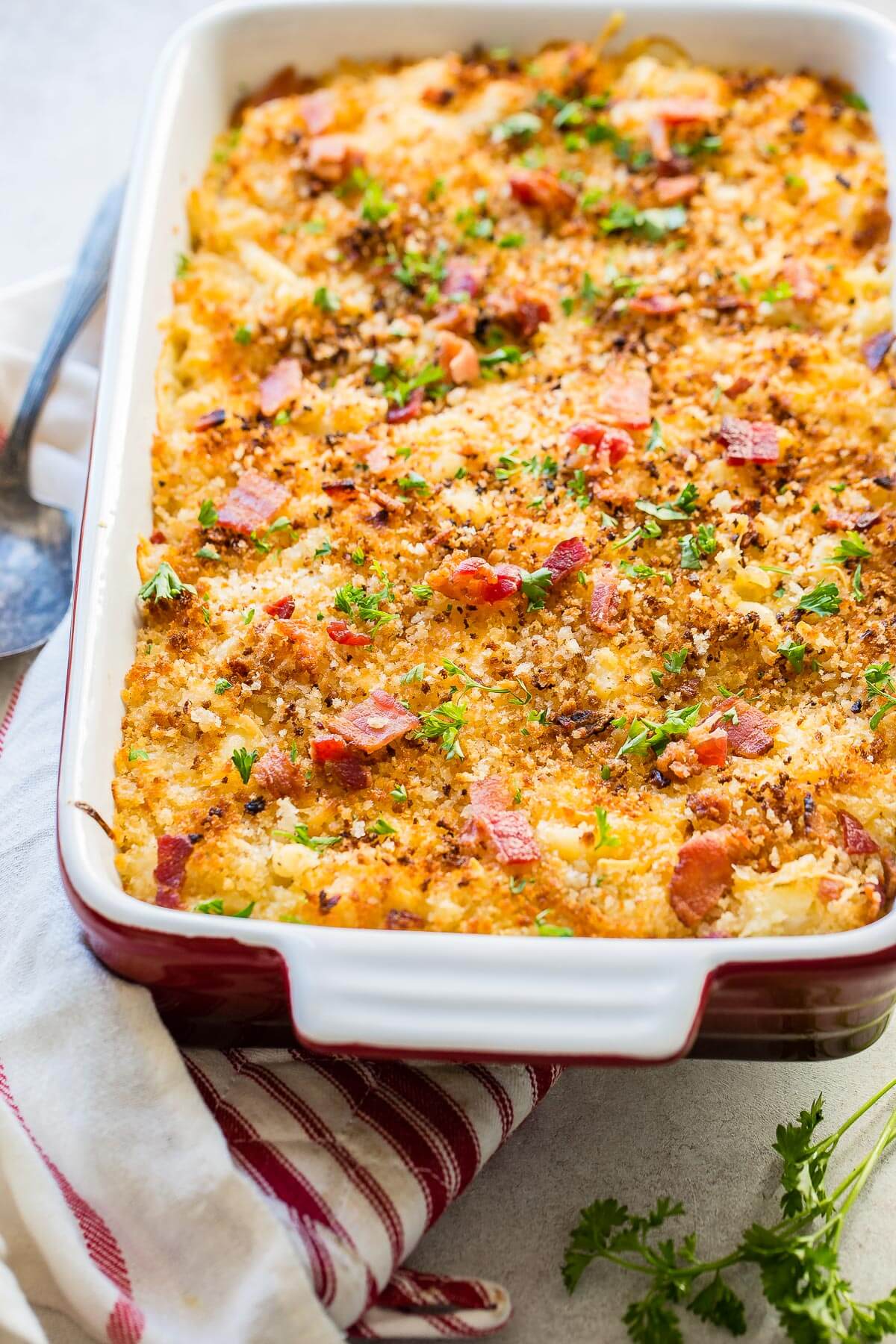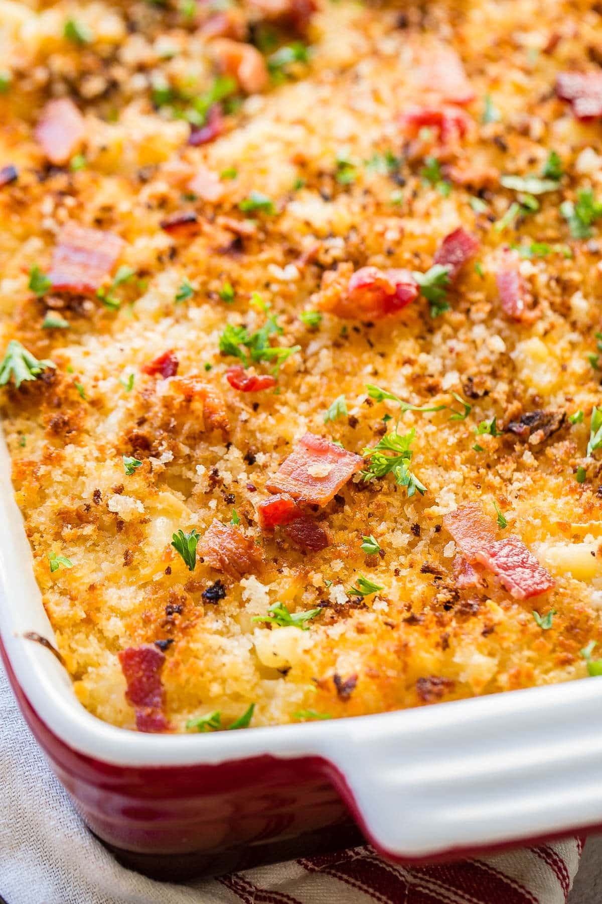 - Trasferire in una casseruola da 9×13 pollici, quindi cospargere con un composto di pangrattato e burro fuso. Guarnire con la pancetta.