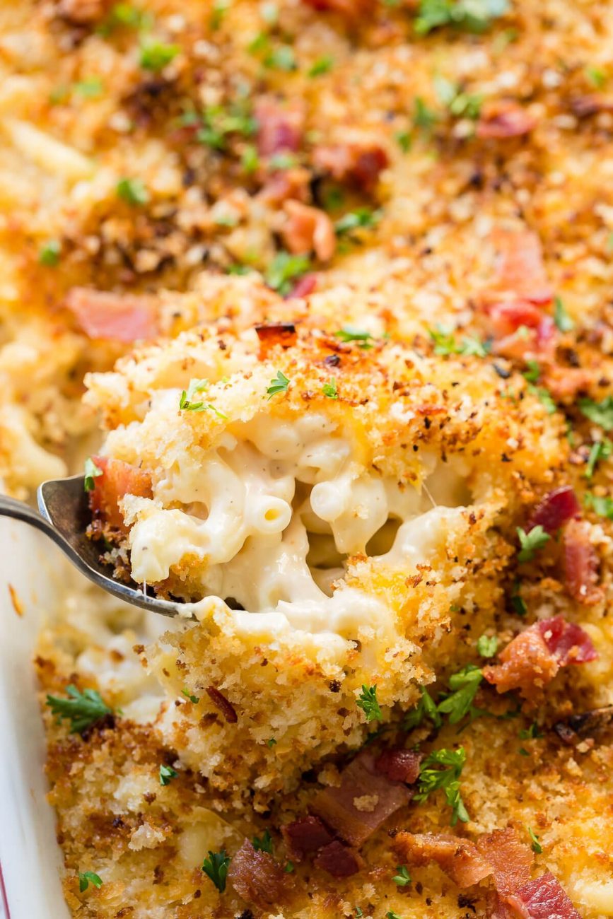 Questi maccheroni e formaggio del ranch con pancetta e pollo al formaggio sono fatti con tre tipi di formaggio, pancetta ed è sormontato da un irresistibile condimento croccante di pangrattato. Perfetto come antipasto o contorno!