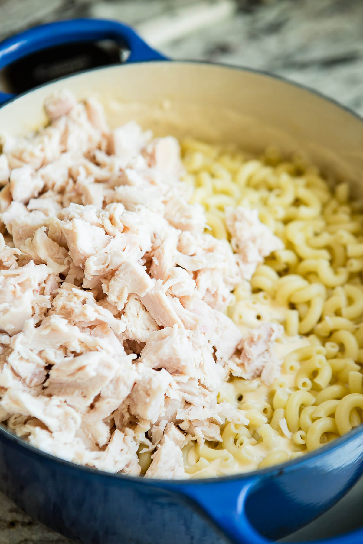 - Aggiungere il pollo e la salsa ai maccheroni, mescolando per unire.