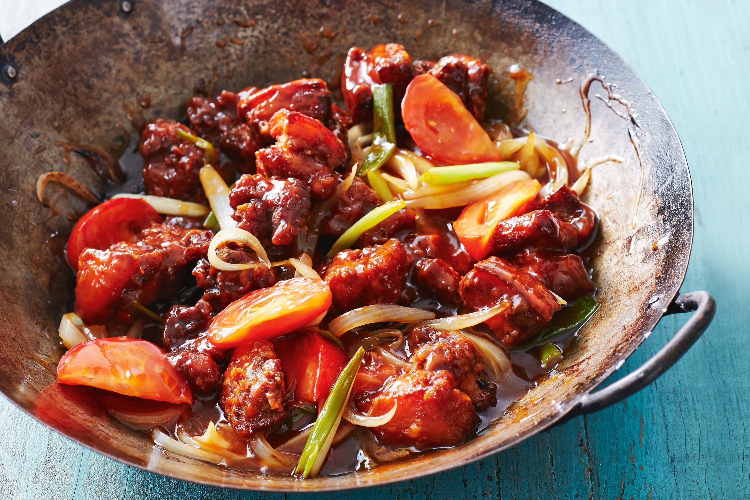 Pulite il peperone, tagliatelo a falde, eliminate i semi e le costole bianche, lavatele e riducetele a cubetti. Eliminate le guaine più esterne del porro e la parte verde, lavatelo e affettatelo. Tagliate a cubetti il maiale e l’ananas. Salate il maiale e mettetelo a marinare in una scodella nel vino di riso per mezz’ora circa. Sgusciate l’uovo in una ciotola, sbattetelo con una forchetta incorporando la maizena e aggiungetelo al maiale mescolando il tutto con cura. Scaldate 4 cucchiai di olio nel work e, dopo averlo passato nella farina, friggetevi il maiale per 3 minuti rigirando con una spatola e un mestolo di legno o con i bastoncini. Togliete la carne dal tegame e ponetevi il peperone e l’ananas; dopo un paio di minuti aggiungete di nuovo il maiale e fate insaporire il tutto per 3-4. Prelevate carne e verdure dal wok e metteteli a scolare su carta assorbente da cucina. Pulite il work, ponetevi un filo d’olio e riscaldatelo a fiamma media, fatevi poi appassire il porro mescolando, versate la salsa agrodolce e, quando sarà ben calda, aggiungete il maiale, il peperone e l’ananas. Lasciate insaporire per qualche istante mescolando, togliete dal fuoco, aggiungete i peperoncini tagliati a rondelle, e servite.