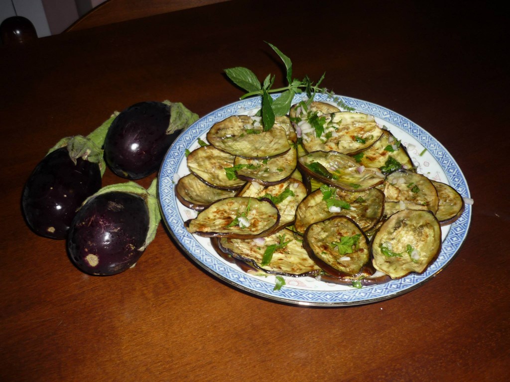 Scegliete melanzane molto grandi per questa ricetta e che abbiano la superficie liscia e uniforme. Dopo averle lavate, eliminate le due estremità delle melanzane, e tagliatele a fette spesse circa mezzo centimetro, se non avete una mano ferma potreste utilizzare, disponendone, di una affettatrice. Quando la padella antiaderente sarà sufficientemente calda, adagiatevi le fette di melanzana avendo cura di non sovrapporle e girandole quando la parte a contatto con la padella sarà dorata. Quando le fette saranno cotte, adagiatele in un contenitore, alternandole con uno strato costituito da un pizzico di sale, un filo d’olio d’oliva, un poco di aceto, aglio e pezzettini di foglie di menta. Procedere in questo modo fino ad esaurimento delle fette di melanzana, e potrete servire immediatamente a tavola la gustosa preparazione o conservarla in frigorifero per qualche giorno, avendo però cura di chiudere accuratamente il contenitore.