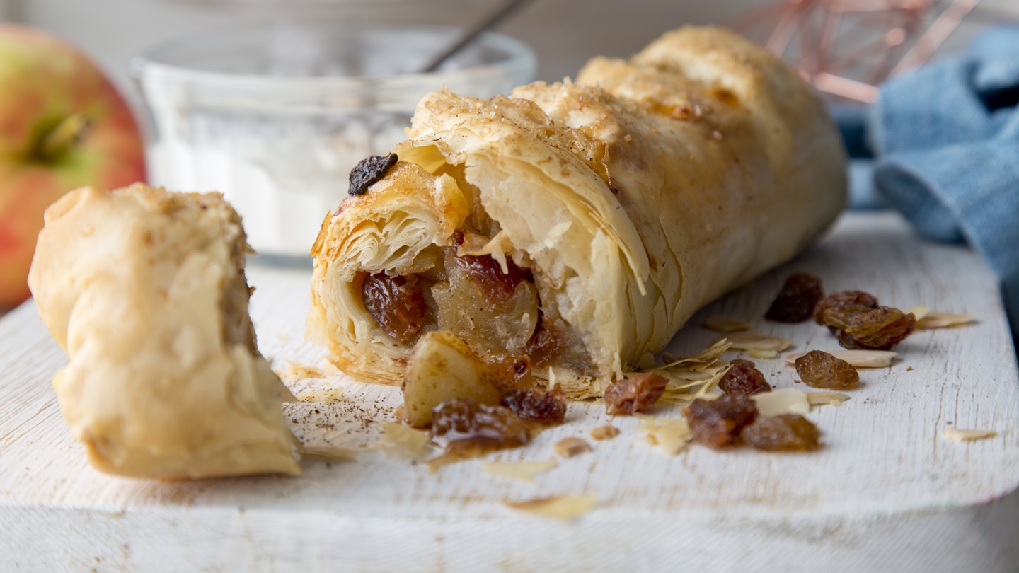 Mettete i datteri, tagliati in 2 parti, in un sacchetto sottovuoto e cospargeteli con la liquirizia tagliata a striscioline; chiudete con la macchina eliminando l’aria e lasciate in infusione 3 giorni. Sbucciate la mela e tagliatela a dadini eliminando il torsolo. Fateli macerare in una bacinella con lo zucchero. Tritate le noci e stendete il rotolo di pasta fillo a 2 strati per volta. Spennellate di burro e cospargete con le mele mescolate alle noci e ai datteri privati della liquirizia e tagliuzzati. Unite il miele e chiudete a rotolo incidendolo esternamente per favorire la fuoriuscita dell’umidità. Spennellate ancora con il burro e infornate a 180°C per 15-20 minuti. Sbattete i tuorli con lo zucchero e aggiungete la fecola. Bollite il latte con la scorza d’arancia e versatelo a filo sul composto. Riportate sul fuoco a fiamma bassa e fate addensare leggermente. Fate raffreddare e unite la panna, precedentemente montata, mescolando delicatamente. Servite lo strudel tagliato a tocchetti accompagnandolo con la crema fredda.