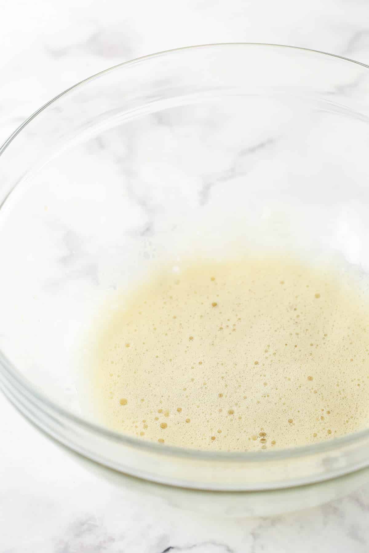 Montare l’albume e la vaniglia: montare l’albume e la vaniglia in una ciotola capiente fino a ottenere un composto spumoso, circa 1 minuto. Puoi farlo a mano con una frusta o usare un mixer.