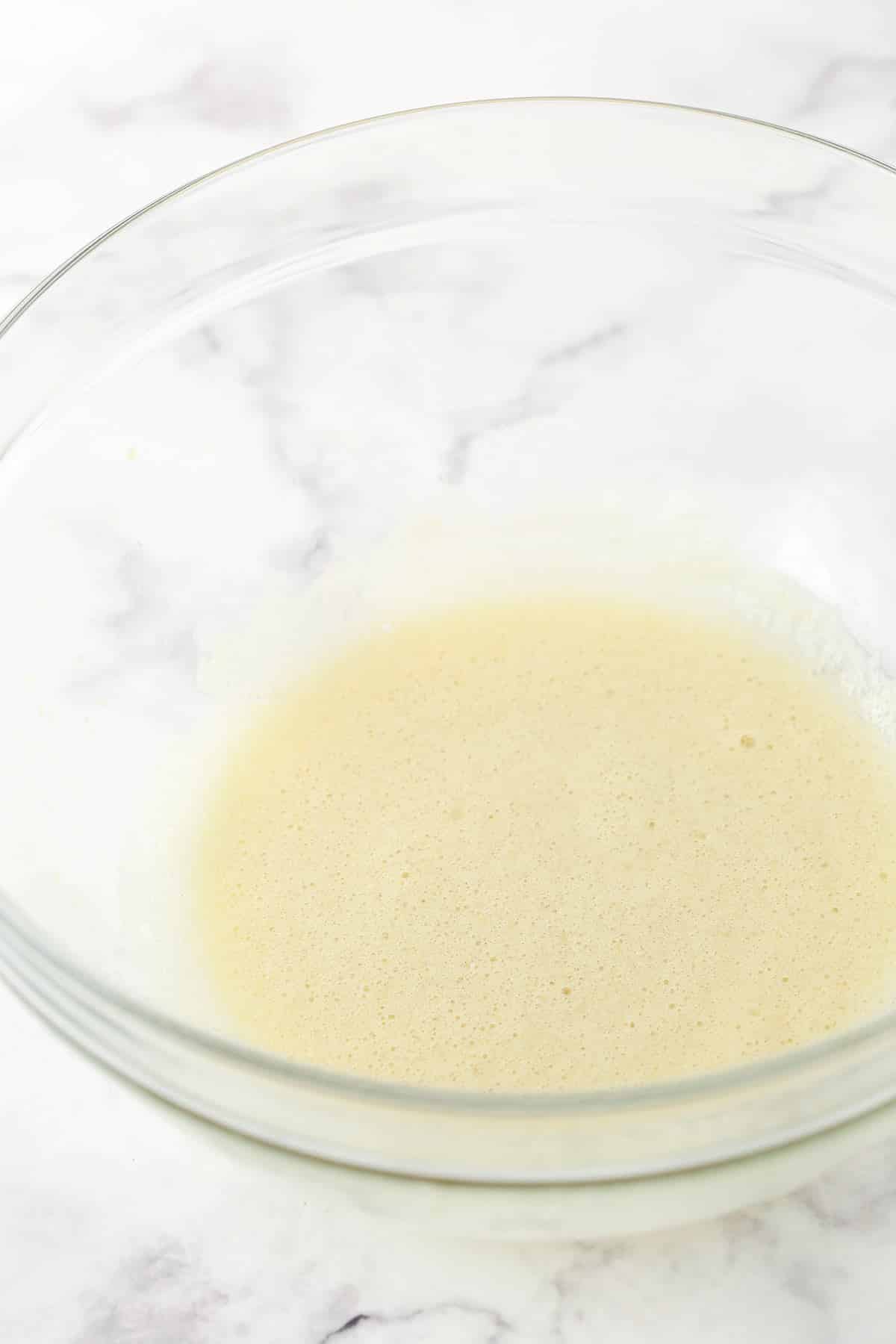 - In una ciotola capiente, montate l’albume e la vaniglia fino a ottenere un composto spumoso (circa 1 minuto). Puoi usare un mixer o farlo a mano con una frusta.