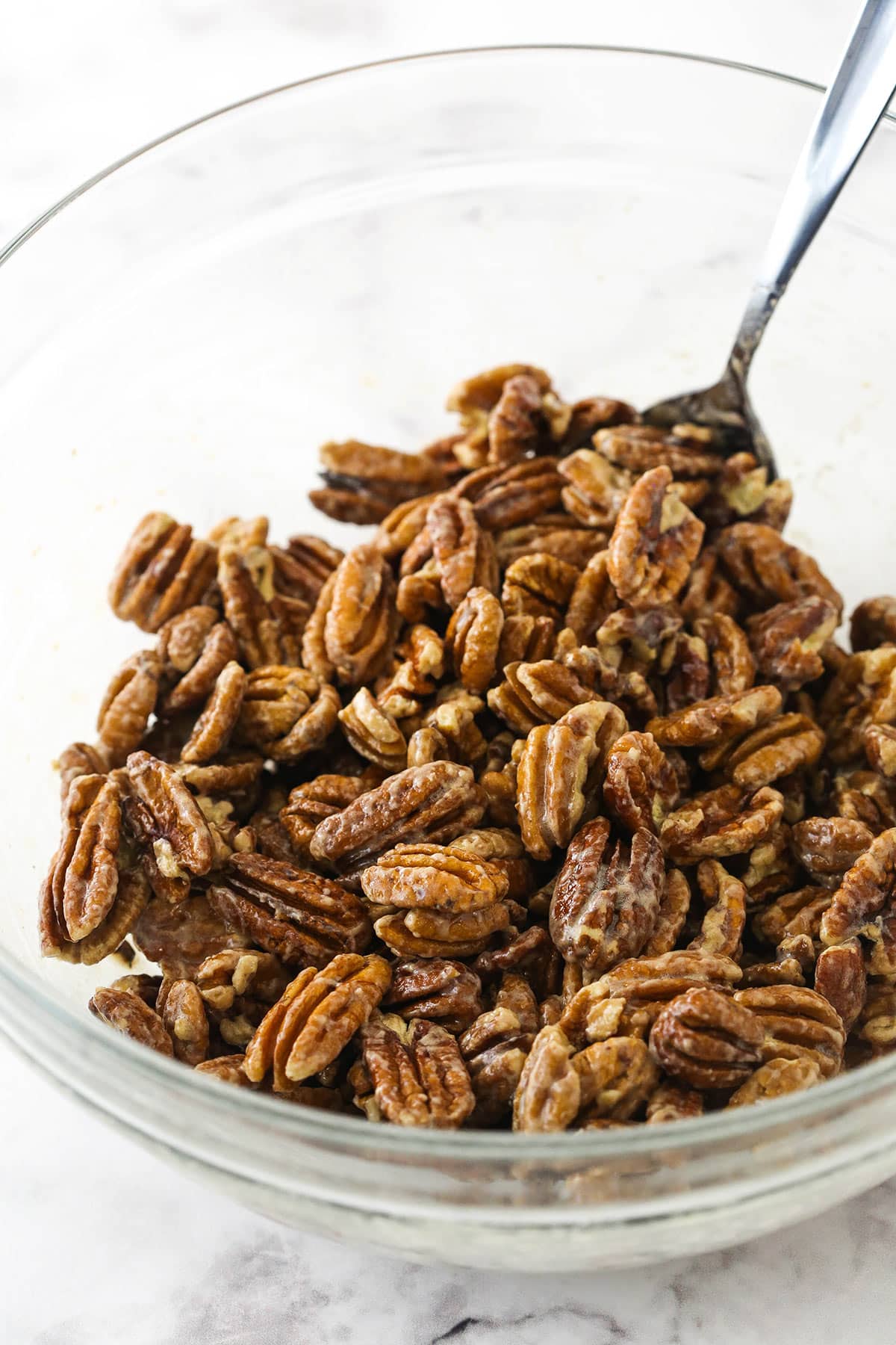 Sì, questa ricetta funzionerà con qualcosa di più delle semplici noci pecan. Vai avanti e sostituiscili con arachidi, mandorle, pistacchi, noci di macadamia, tutto ciò che ti piace! Ricorda che potresti dover regolare il tempo di cottura se le noci che usi sono significativamente più piccole o più grandi delle noci pecan.