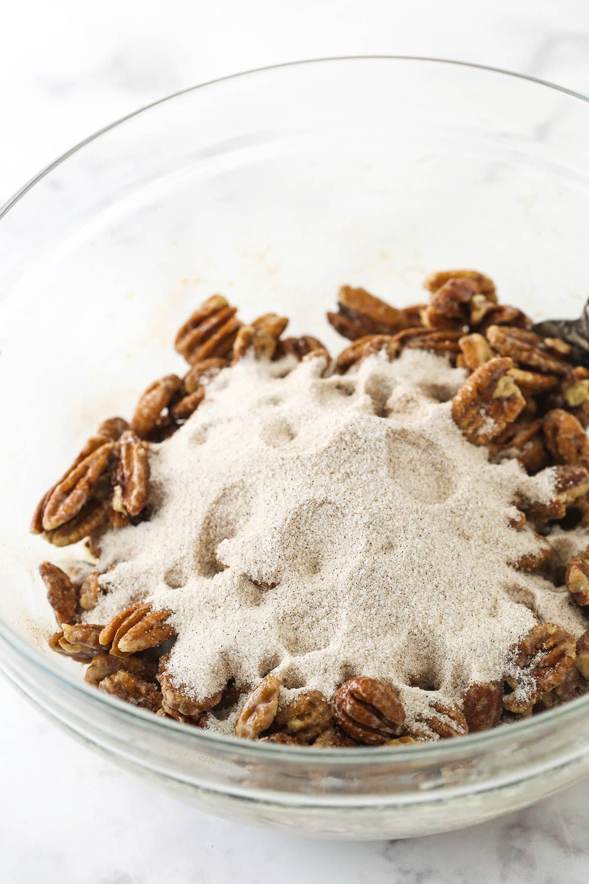 - Aggiungere la miscela di zucchero alle noci pecan e mescolare fino a quando non saranno rivestite uniformemente.