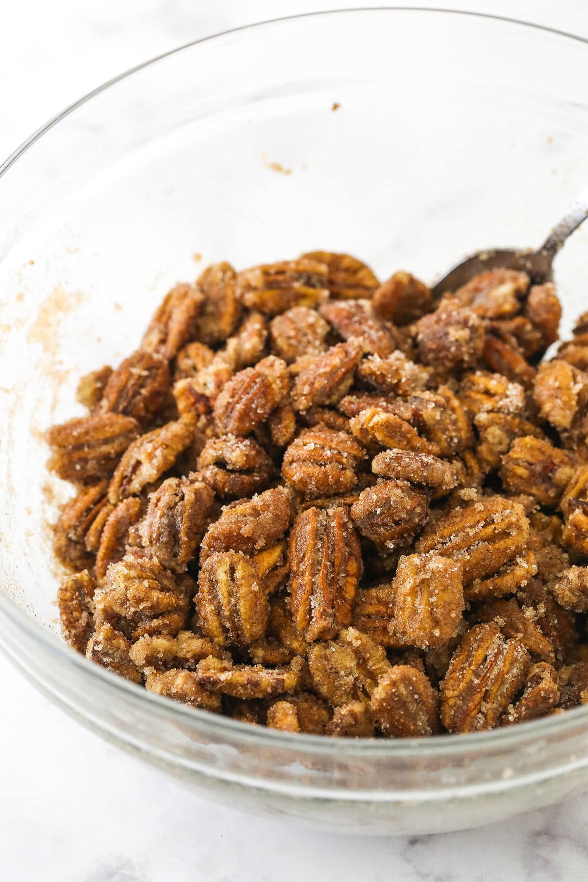Adoro sempre l’odore delle noci pecan candite quando sono fuori durante le vacanze e qualcuno le prepara e le vende nelle vicinanze. L’odore è piuttosto inebriante. È una delle cose meravigliose del prepararli a casa: non solo puoi goderteli, ma rende anche la tua casa un profumo meraviglioso!
