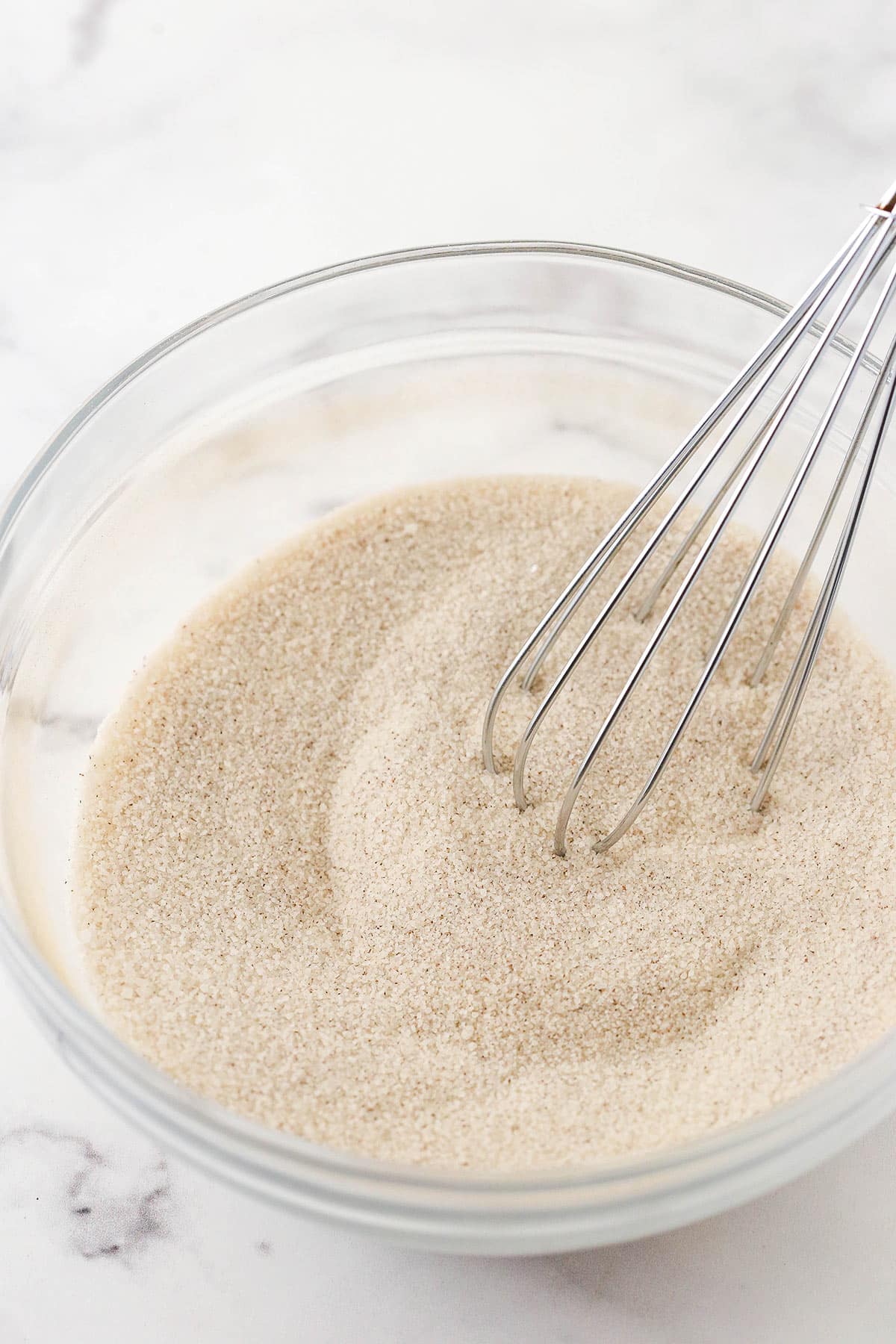 - In una piccola ciotola, unire lo zucchero, la cannella e il sale. Mettere da parte.