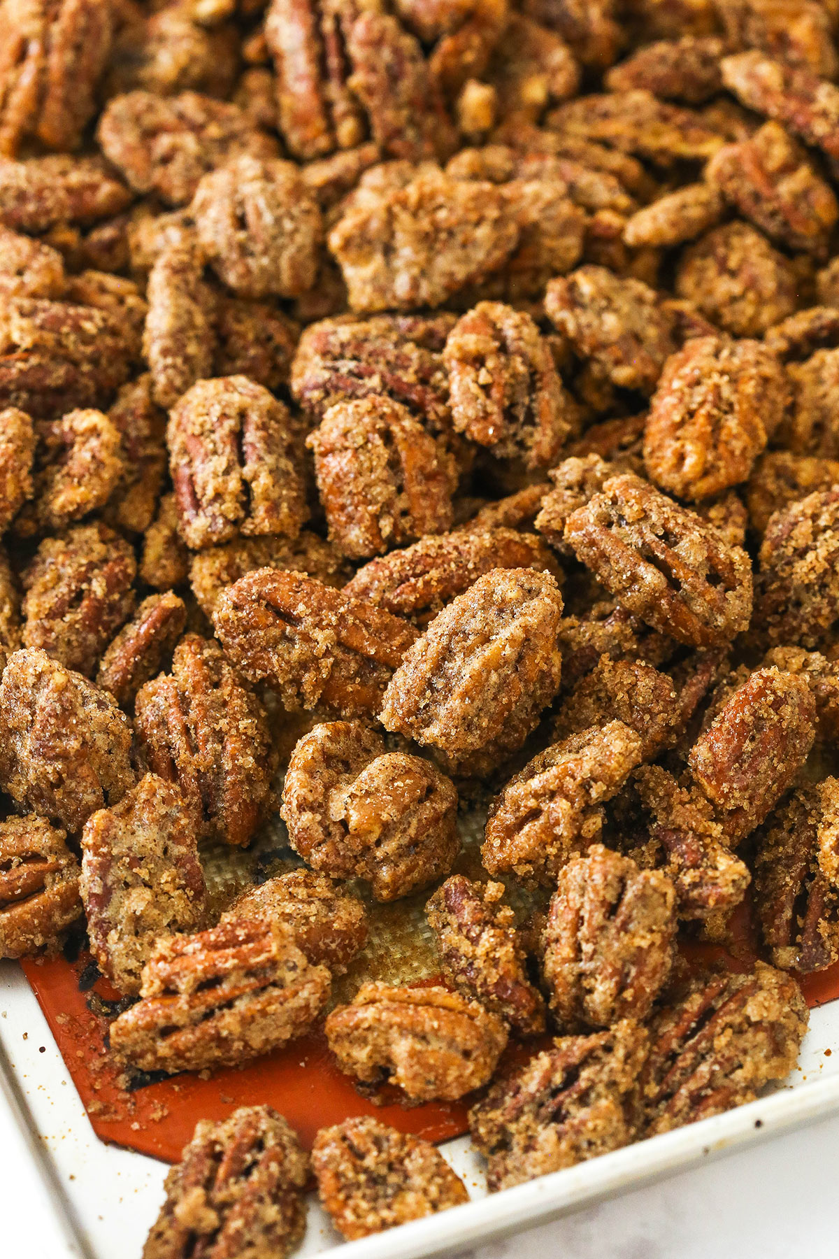 Ricoperte da una copertura di zucchero alla cannella e caramellate in forno, queste croccanti noci pecan candite diventeranno rapidamente il tuo nuovo snack preferito. Sono facilissimi da preparare e rimangono freschi a temperatura ambiente per settimane!