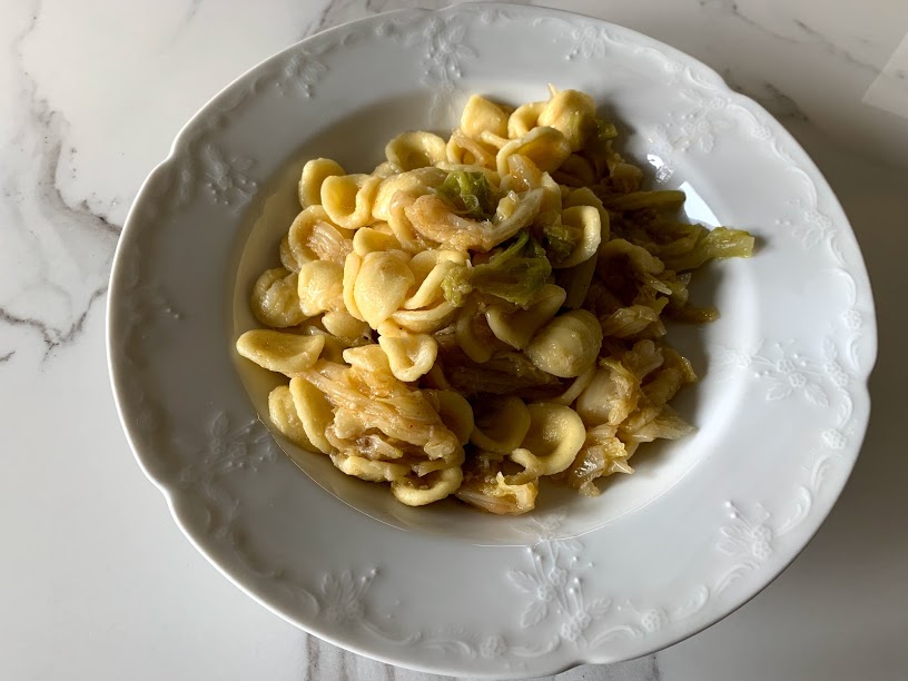 Per prima cosa prendiamo una pentola con abbondante acqua e adagiamola sul fuoco, a parte tagliamo il cappuccio e quando l’acqua bolle sbollentiamolo per circa dieci minuti. Trascorsi i 10 minuti possiamo scolarlo e metterlo da parte. In una padella inseriamo l’olio evo e lo spicchio d’aglio, facciamo soffriggere, quando il condimento soffrigge possiamo inserire il cappuccio, sbollentato in precedenza, aggiungiamo il sale, un cucchiaino di pepe rosso macinato e copriamo d’acqua, facciamo andare finché l’acqua non si restringe. Mentre il cappuccio continua a cuocere, prendiamo una pentola con abbondante acqua salata e portiamo ad ebollizione, quando l’acqua bolle immergiamo le orecchiette e facciamo cuocere per 15 minuti, come è indicato sulla confezione. Trascorso il tempo di cottura della pasta, scoliamola e inseriamola nel condimento cucinato in precedenza. Amalgamiamo il tutto, spolveriamo con il pepe nero e serviamo ben calda nei piatti da portata.