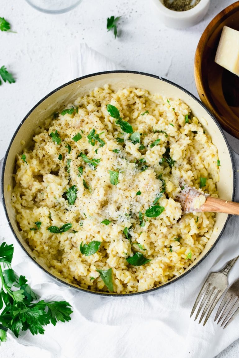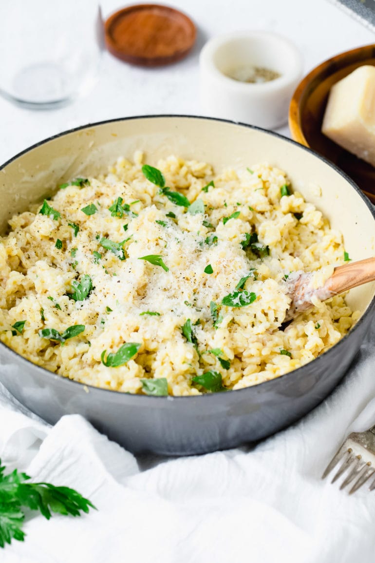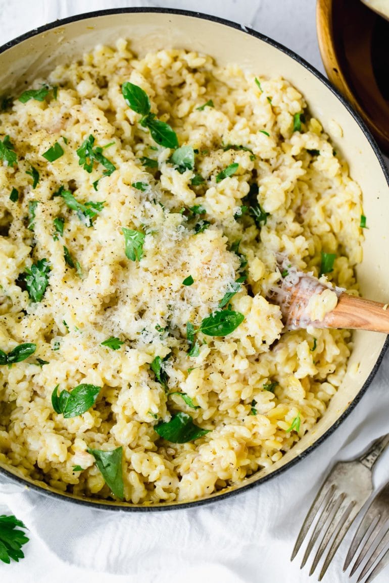- Metà e metà: preferiamo di gran lunga usare metà e metà in questa ricetta poiché rende un orzo ultra-cremoso. Tuttavia, se non hai metà e metà a disposizione, puoi ottenere risultati simili usando il latte intero. Basta evitare di usare qualcosa a basso contenuto di grassi, altrimenti l’orzo al parmigiano sarà troppo magro.