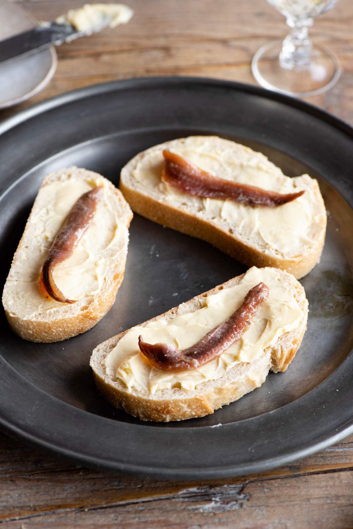 Spesse fette di pane bianco croccante, spalmate di burro e condite con acciughe salate. Lo spuntino o l’antipasto più semplice che puoi preparare in un batter d’occhio. Servire con un cocktail aperitivo o un bicchiere di vino!