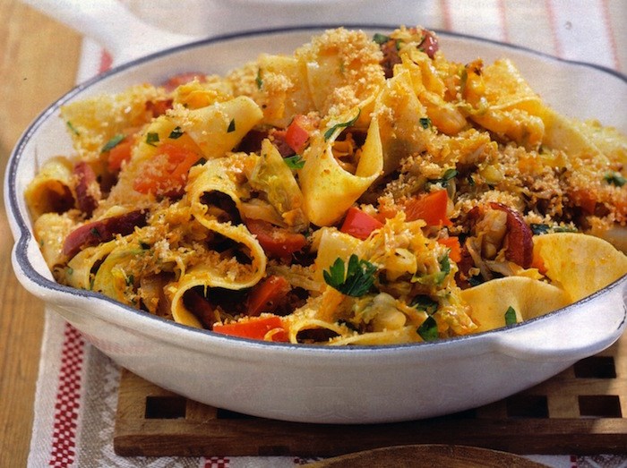 Mondate la verza, tagliatela a strisce corte e sottili, lavatela e scolatela bene. Pelate e tritate la cipolla. Tagliate a tocchetti la pancetta e rosolatela in una padella con l’olio, quindi aggiungete lo zucchero e fatela caramellare, mescolando, finché avrà preso un bel colore dorato. Aggiungete i semi di cumino, sale e pepe. Unite la verza e fatela appassire a fiamma bassa per 15 minuti. Nel frattempo cuocete al dente le pappardelle in abbondante acqua salata, scolatele e trasferitele nella padella con la verza e la pancetta. Mescolate per 2 o 3 minuti, spolverizzate con sale,, pepe e paprika e distribuite le pappardelle nei piatti individuali. Cospargete la pasta con il trito di prezzemolo e servite in tavola.
