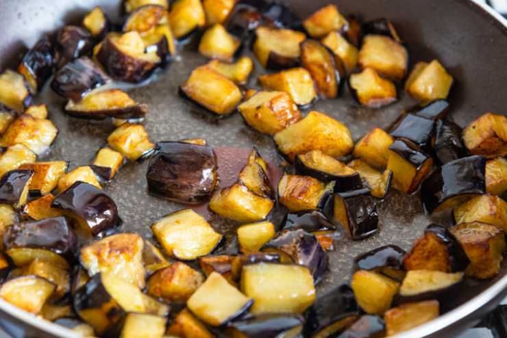 Inizia lavando e tagliando le melanzane a fette spesse di circa 1 cm e poi a dadini. In una padella ampia, soffriggi lo spicchio d’aglio sbucciato con 3 cucchiai di olio extravergine a fiamma medio-alta. Aggiungi i dadini di melanzane e soffriggi per un paio di minuti.