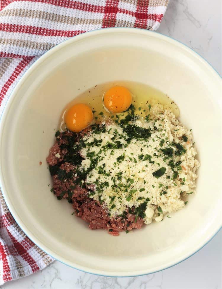 - In una ciotola unire 250 grammi di tris di carne macinata (metà confezione); mollica fresca di pane di un giorno inzuppata nel latte; pecorino romano grattugiato; uova; prezzemolo fresco; olio d’oliva; uno spicchio d’aglio tritato finemente; un pizzico di sale e pepe nero. Schiacciare tutti gli ingredienti insieme con una forchetta o con le mani.