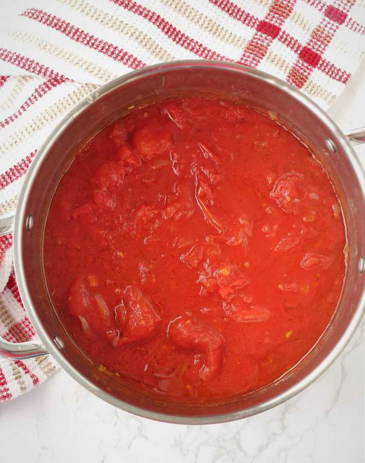 Nel frattempo preparate una salsa di pomodoro base. Scaldare l’olio d’oliva in una casseruola, aggiungere una piccola cipolla tagliata a dadini e soffriggere fino a renderla morbida. Mescolare in uno spicchio d’aglio tritato finemente. Aggiungere una lattina di pomodori pelati italiani interi. Spezzettare i pomodori con il dorso di un cucchiaio di legno o utilizzare uno schiacciapatate. Mescolare in un barattolo di passata di pomodoro (passata di pomodoro).