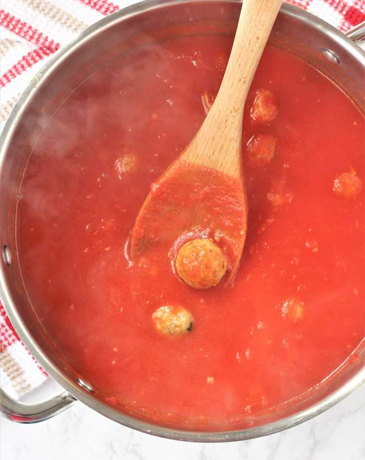 Portare a ebollizione, quindi abbassare a fuoco lento. Quando le polpette saranno rosolate, aggiungetele con cura al sugo e fate cuocere coperte per 1 ora e mezza. Aggiungere sale e pepe a piacere.