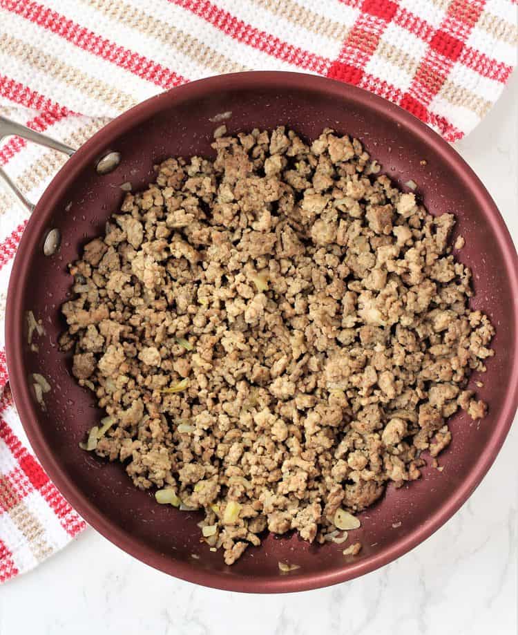 - Tris di carne macinata rimanente: scaldare l’olio d’oliva in una piccola padella. Soffriggere una piccola cipolla a dadini, un piccolo spicchio d’aglio tritato e il trito di carne macinata rimanente. Aggiungere un pizzico di sale e pepe, a piacere. Cuocere fino a quando non è più rosa. Trasferire in una ciotola a raffreddare.