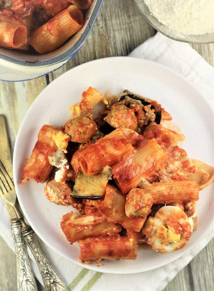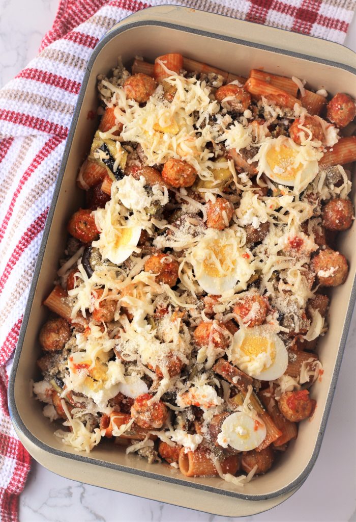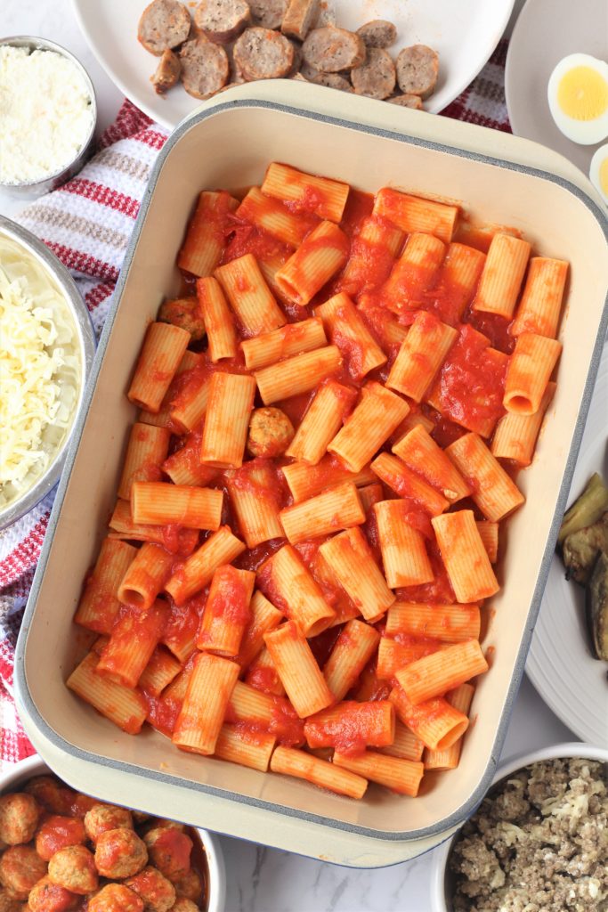 Tuttavia alcuni passaggi possono essere preparati il giorno prima come le polpette e la salsiccia al sugo di pomodoro e le melanzane arrostite. Il giorno dopo lessare la pasta, assemblare e infornare.