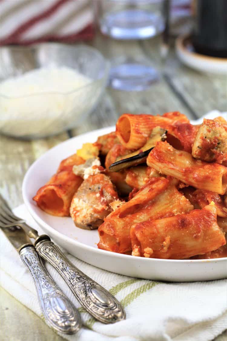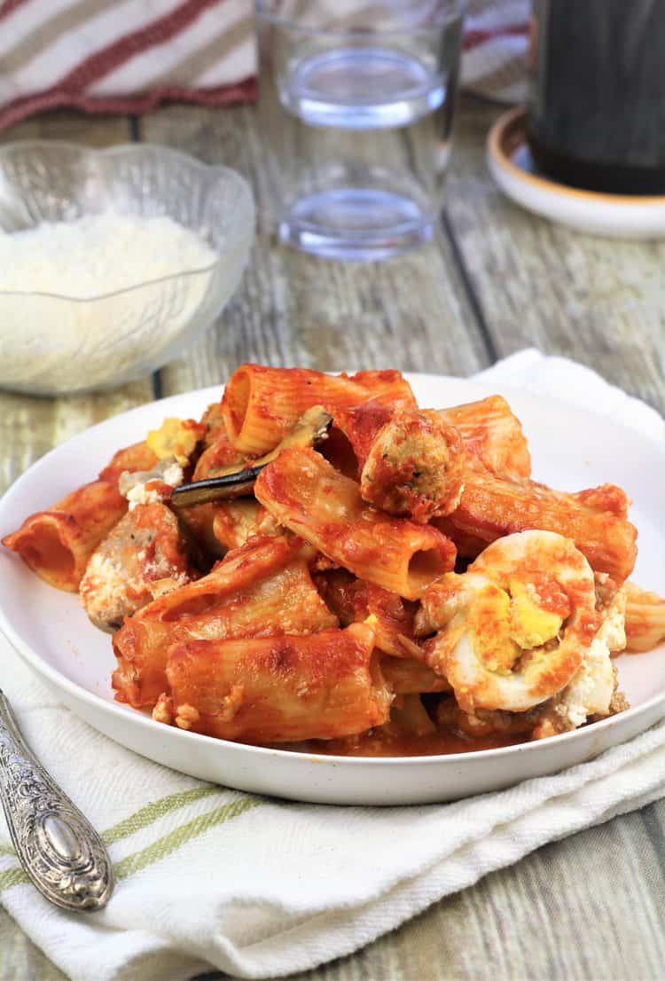 La pasta al forno alla siciliana è diversa dal solito piatto di pasta al forno. Questa pasta al forno alla siciliana è a strati con melanzane; piccole polpette; uova sode; carne macinata; ricotta; e mozzarelle. Un tipico pranzo domenicale e perfetto per sfamare molte persone!