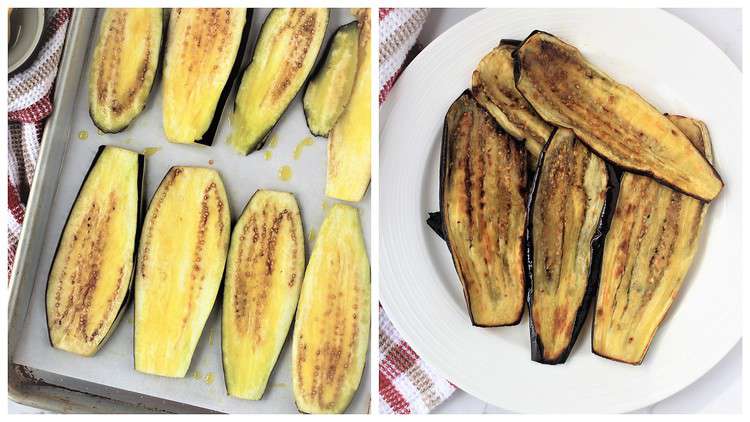 - Melanzane: togli circa metà della pelle (o sbuccia completamente se preferisci) da una melanzana di medie dimensioni (circa 350 grammi). Tagliate per il lungo a striscioline di 1/2 cm. Adagiate su una teglia ricoperta di carta da forno, spennellate entrambi i lati con olio d’oliva e salate leggermente. Cuocere a 425 gradi F (218°C) per circa 20 minuti, girando a metà, fino a doratura. Mettere da parte a raffreddare.