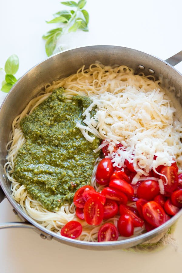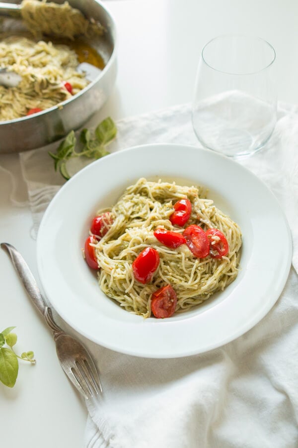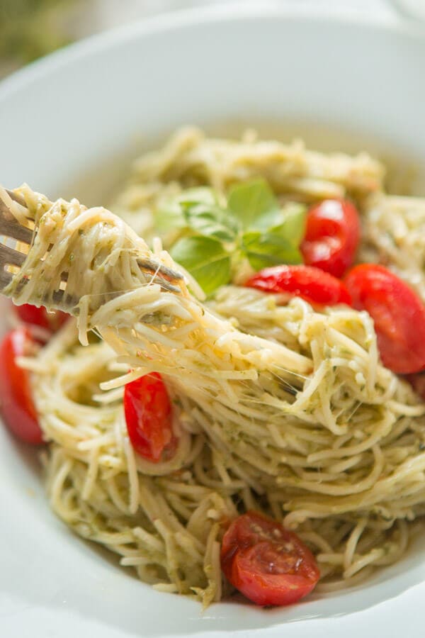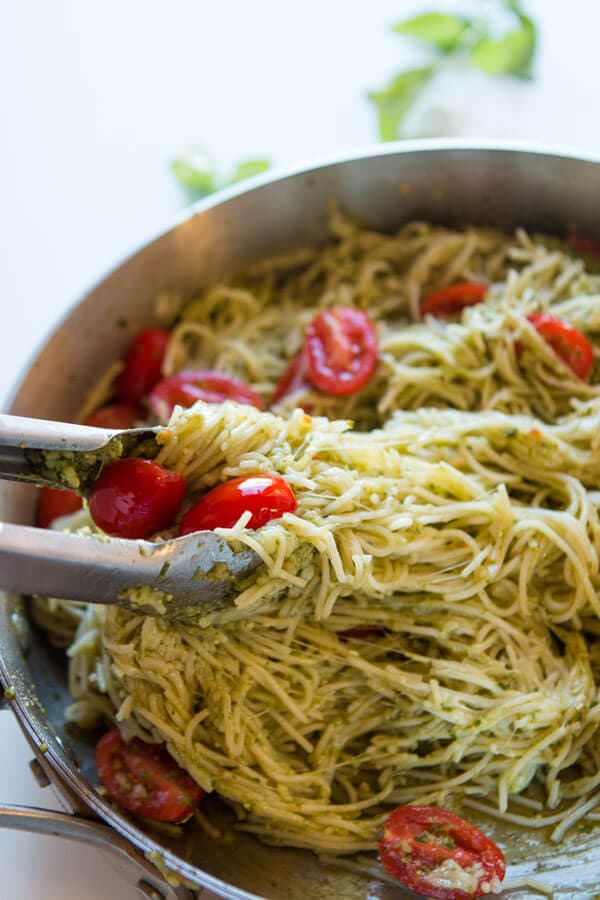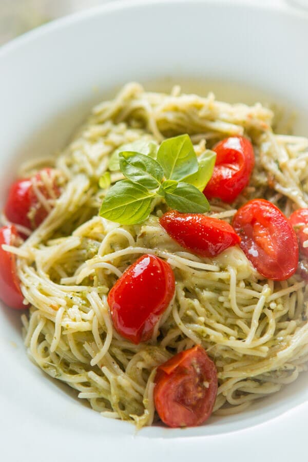 Se hai bisogno di ricette vegetariane o senza glutine, questa pasta al pesto di basilico è un’ottima opzione per la cena. Puoi aggiungere il pollo per renderlo un piatto più sostanzioso, ma in realtà è davvero fantastico con solo pomodorini. Diamine, potresti anche buttare dentro le zucchine tritate, che sarebbero anche buonissime. In effetti, penso che lo farò la prossima volta.