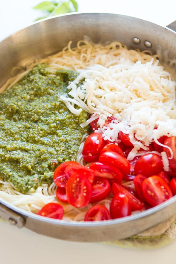 Manteniamo questa pasta al pesto di formaggio semplice con una tazza di mozzarella sminuzzata a bassa umidità, in parte scremata, ma potresti certamente usare la mozzarella fresca, devi solo essere consapevole dell’acqua.