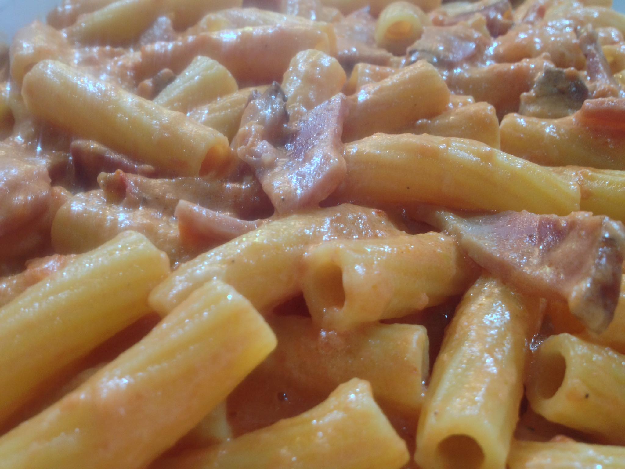 Fare rosolare la pancetta nel burro. Unirvi la passata di pomodoro. Appena sarà cotta aggiungervi la scamorza tagliata a cubetti e girare. Chiudere il fuoco e aggiungere la panna. A parte fare bollire l’acqua salata e cuocervi la pasta. Scolare al dente e mettere nella padella con il sugo.