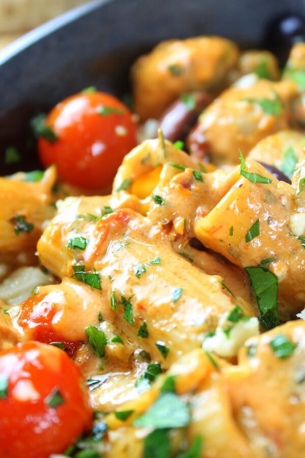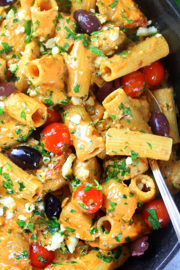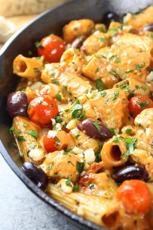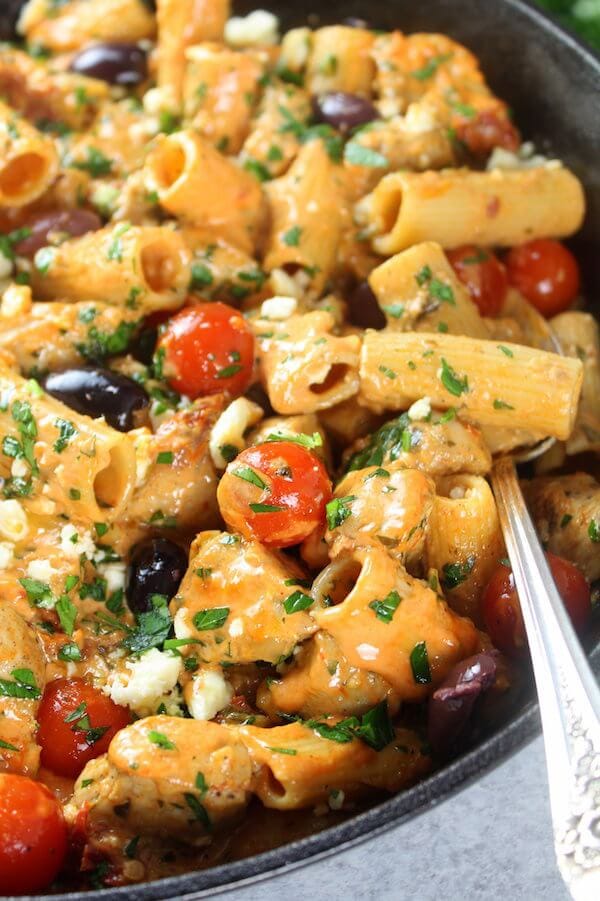 Questa pasta alla greca con pollo è piccante e cremosa e piena di tutti i tuoi sapori mediterranei preferiti! Con pomodori secchi, formaggio feta, olive Kalamata, aglio, pollo, pasta e altro ancora: è davvero un pasto che tutta la famiglia adorerà!