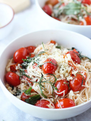 Questa pasta capelli d’angelo con pomodorini e basilico si unisce in meno di 20 minuti, creando un pasto delizioso e super facile per la tua famiglia!