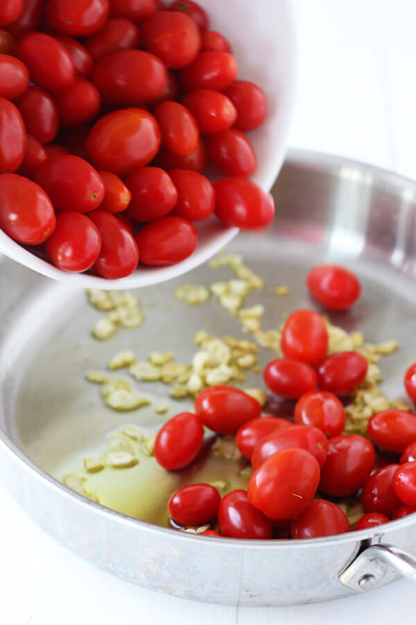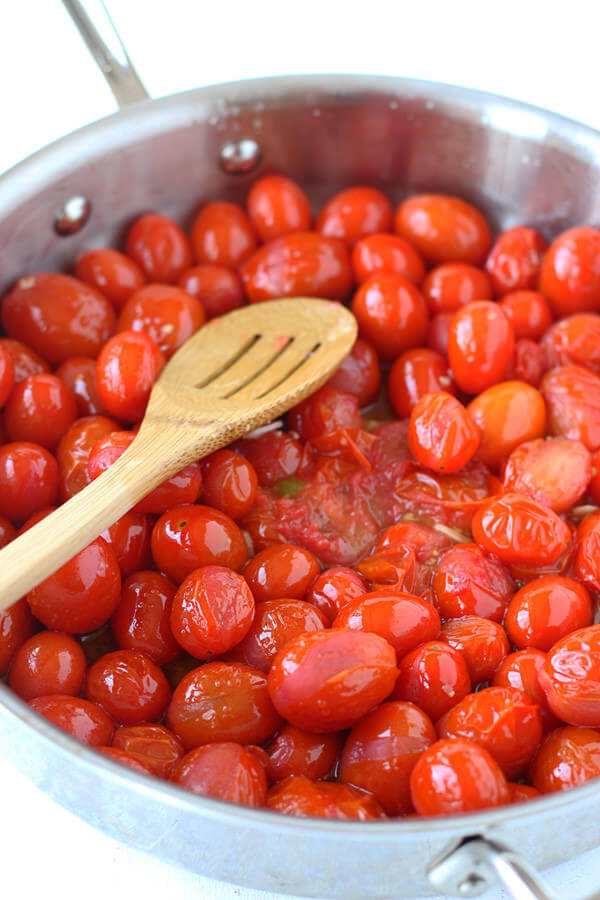 La salsa inizia con un piccolo esercito di aglio affettato sottilmente che fa il bagno nell’olio d’oliva caldo, ma non urlante. Vengono quindi gettati due chili di pomodori ciliegini (o d’uva), il calore aumenta e si guarda semplicemente mentre l’olio caldo funziona è magico sui pomodori, facendoli bollire ed esplodere mentre cuociono.