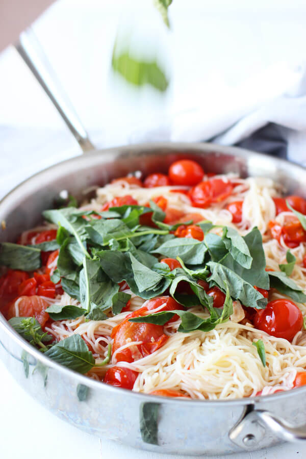 Quando arriva la fine dell’estate, sono immediatamente attratto da un modo più semplice di cucinare: pasti più leggeri e più sani, ingredienti freschi, meno ingredienti e solo un atteggiamento rilassato. Non mi piace niente di troppo pignolo o coinvolto, e questa Pasta capelli d’angelo con pomodorini e basilico in 20 minuti è l’esempio perfetto di ciò che potresti trovare sulla nostra tavola questo mese.