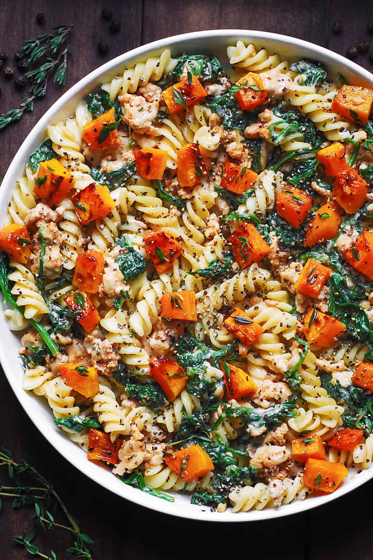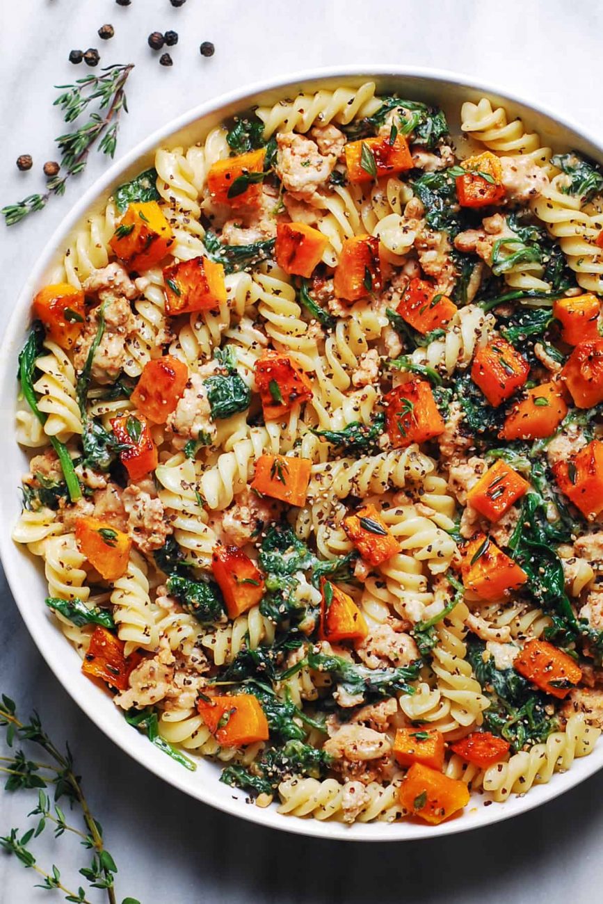 La pasta cremosa con macinato di tacchino con zucca e spinaci è una cena deliziosa che piacerà a tutta la famiglia! Se stai cercando la ricetta del tacchino macinato, non cercare oltre questo piatto gustoso, colorato e vivace!