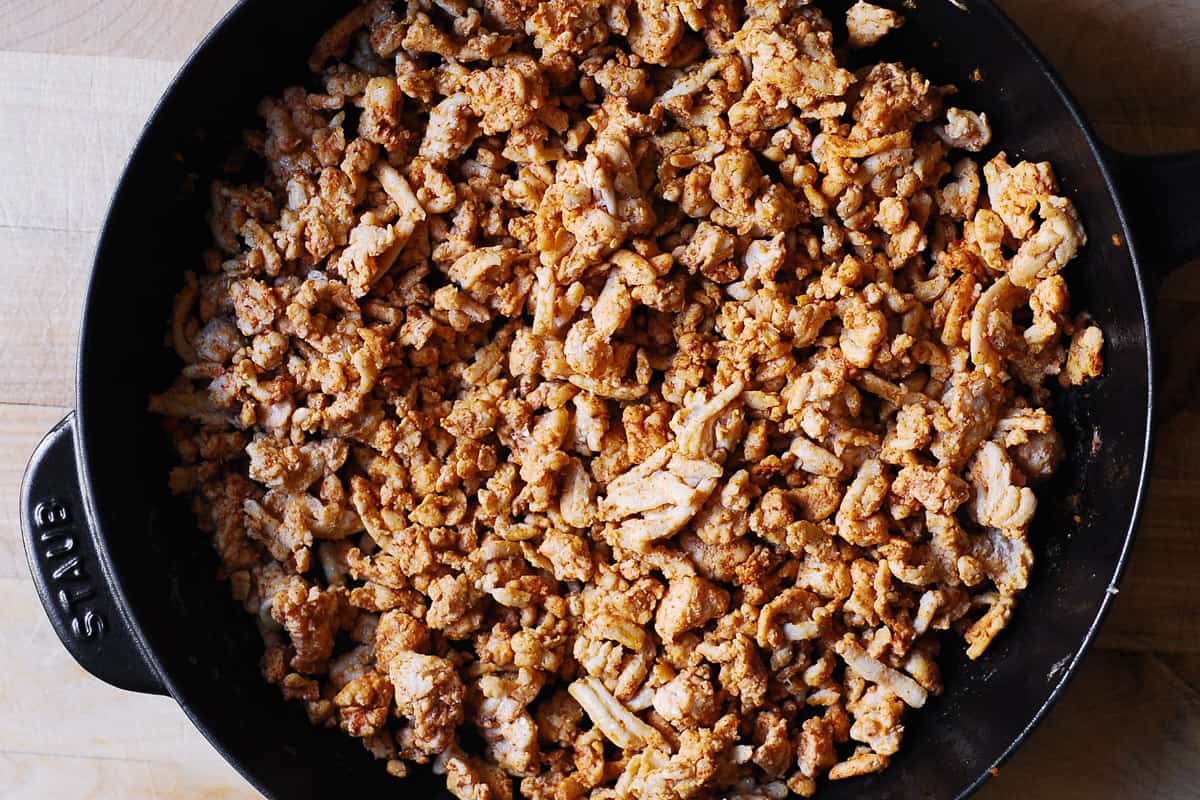 Quindi, cuocere il tacchino macinato (condito con paprika affumicata, peperoncino in polvere e sale) in olio d’oliva.