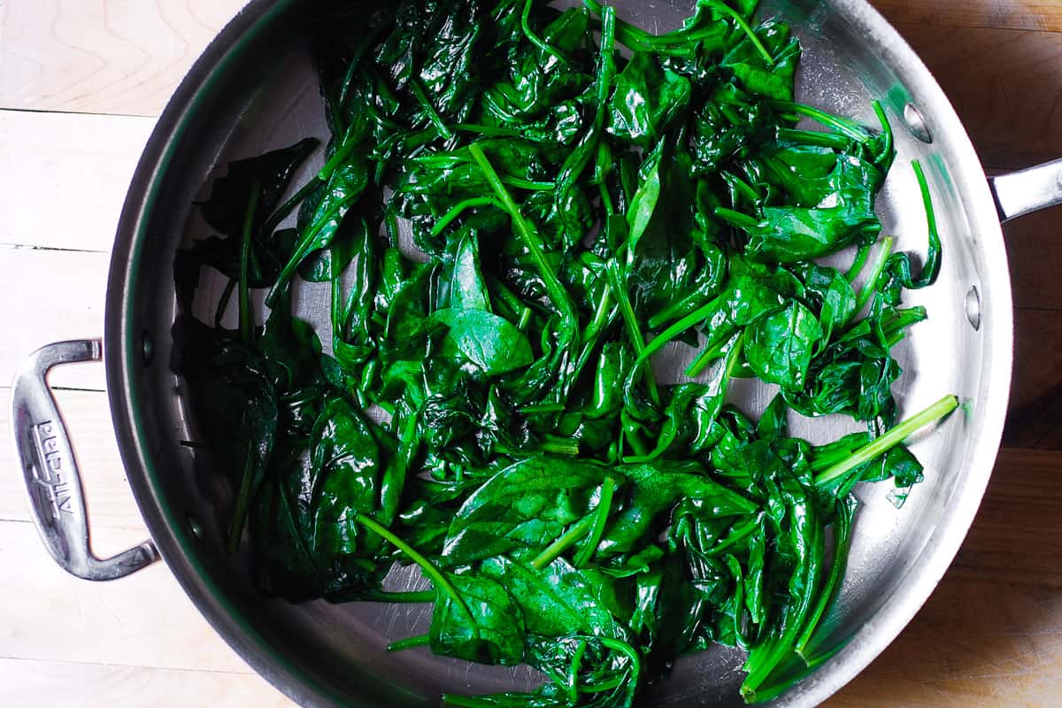 - In una padella ampia e separata, scalda 1 cucchiaio di olio d’oliva e aggiungi gli spinaci a fuoco medio. Cuocere, mescolando di tanto in tanto, per circa 5 minuti fino a quando gli spinaci iniziano ad appassire.