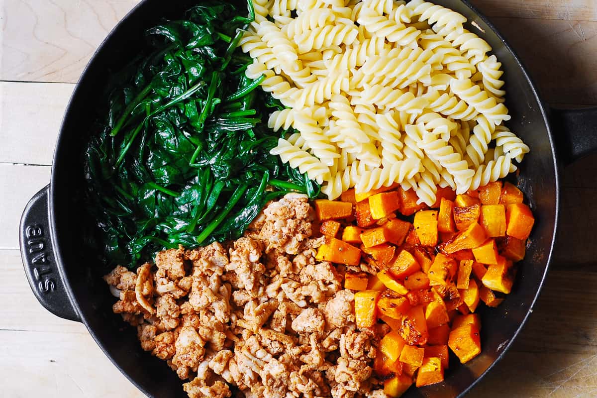 Questa deliziosa pasta è ricca di verdure (zucca e spinaci arrostiti), ha proteine magre (tacchino macinato) ed è un pasto ben bilanciato.
