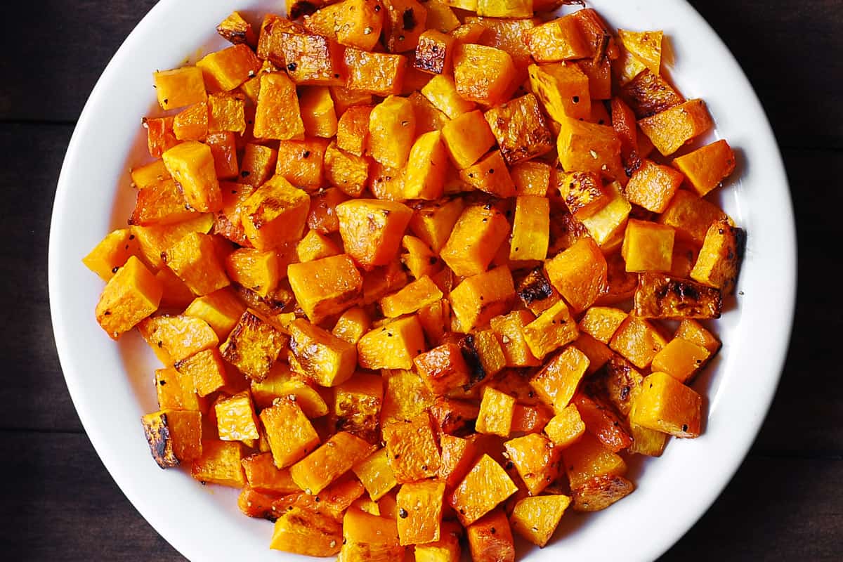 Per prima cosa, arrostire la zucca. Se vuoi sapere tutto su come sbucciare, seminare, tagliare a cubetti e arrostire la zucca, dai un’occhiata alla mia ricetta base molto dettagliata per la zucca arrostita.