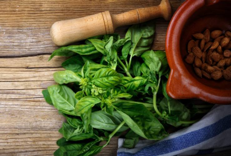 Nel frattempo, preparate il pesto alle mandorle. Fate tostare le mandorle in una padella antiaderente per circa 5 minuti. Trasferitele nel mixer insieme a un generoso filo d’olio extravergine, lo spicchio di aglio spellato e il basilico spezzettato a mano. Frullate fino a ottenere un pesto grezzo.