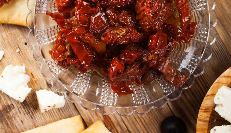 Mentre la pasta cuoce, taglia i pomodori secchi a pezzetti e trita finemente il basilico. Una volta che la pasta è cotta al punto giusto, scolala e condiscila con un filo d’olio. Lasciala raffreddare.